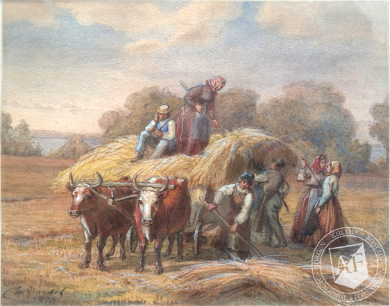Fritz von Dardel preferably painted in watercolors, often with scenes from the Swedish royal court but also images of every day events, the latter which the board ‘Harvest Scene’ from 1870 is an example. ‘Harvest Scene’ was donated to the Academic Society by Fritz von Dardel in 1871.